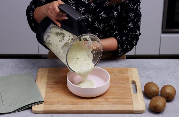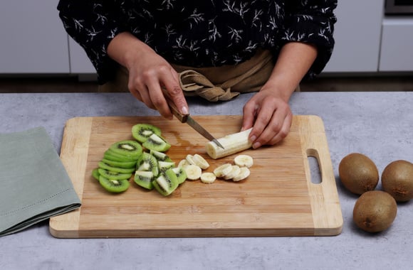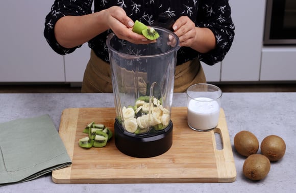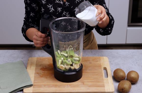 4Dans le bol d'un blender, mettez les rondelles de banane et ajoutez les morceaux de Kiwis de l'Adour IGP.