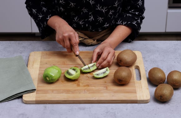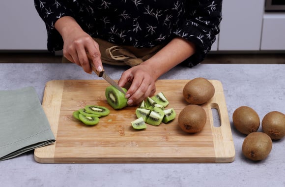 1Épluchez quatre Kiwis de l'Adour IGP. Coupez-les en quatre en morceaux.