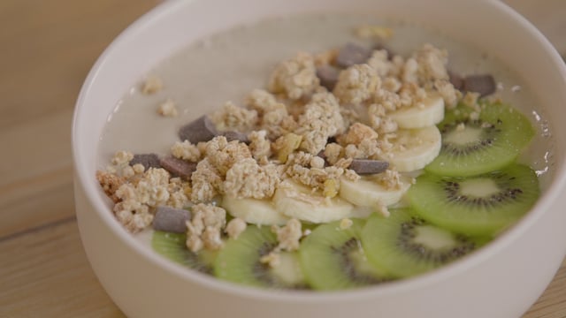 Placez le mélange dans 2 bols puis décorez-les en disposant des rondelles de kiwi et de la banane restante