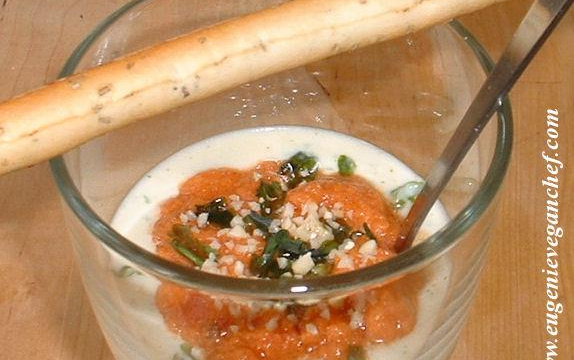 Remplir un verre avec le smoothie de courgette. Ajouter doucement le coulis aux 2 tomates. Parsemer de noix de cajou concassées finement et saupoudrer de laitue de mer. Déguster.