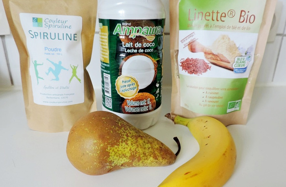 NB: éventuellement, ajouter 1cs de sucre fin avant de mixer. Et c'est une recette idéale pour la banane et la poire qui attendent... Si vous n'avez pas de linette, ni de spiruline, ce n'est pas si grave!