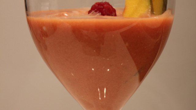 Servir très frais avec une framboise et des tranches fines de mangue.
