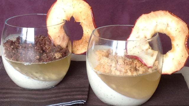 Au moment de servir, saupoudrer le streusel sur les verrines, placer une chips de pomme sur le bord de la verrine. Déguster !