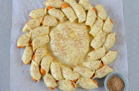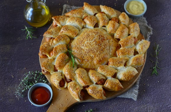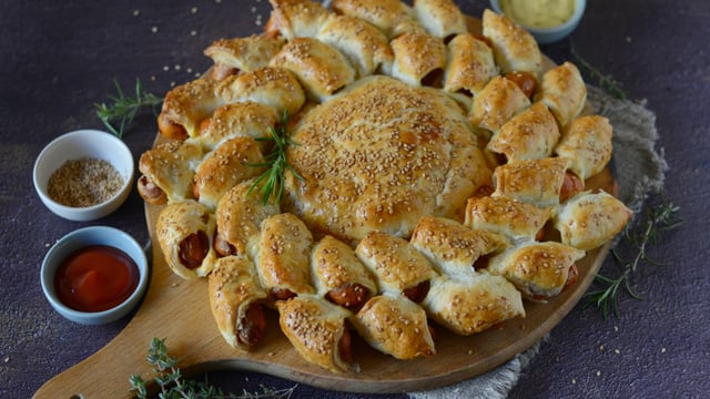 Pour un apéritif en famille ou entre amis. Pour un brunch ou un pique-nique, ce soleil feuilleté à la saucisse est une merveille pour les pupilles et les papilles.