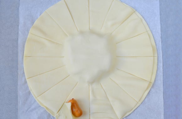 6Refaites l'opération sur les bandes de pâtes feuilletées du bas jusqu'à obtenir un façonnage soleil.