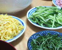 Dressez votre table avec les somen, les lanières d'oeuf, de jambon, de concombre, de shiso et les shiitake confits.