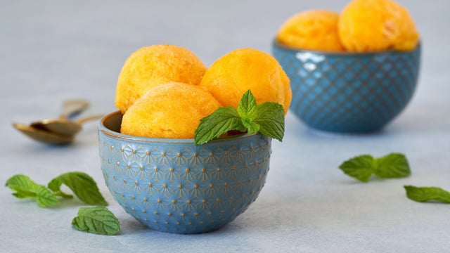 Peler et couper en morceaux votre mangue. Mettre dans le bol et mixer 15 sec vitesse 5. Racler les bords, et réserver. Nettoyer le bol. Verser 60 cl d'eau et le sucre dans le bol et mixer 12 minutes à 100° vitesse 3. Ajouter 40 cl d'eau froide et la mangue et mixer 10 sec vitesse 3. Ajouter les blancs et mixer 12 sec vitesse 4. Verser dans un bac et réserver au congel.