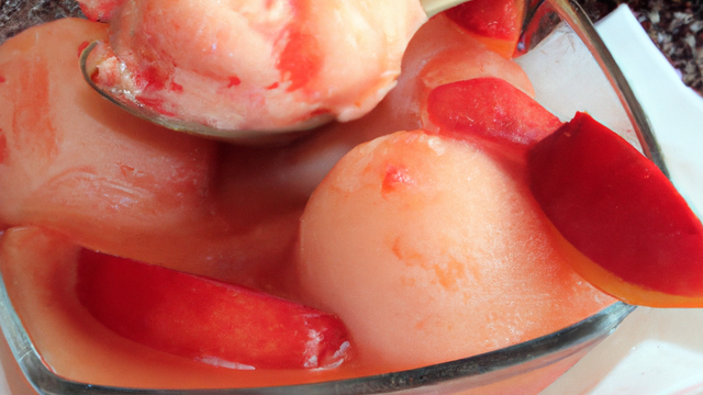 - A l'aide d'une moulinette, passer les pêches et les abricots.Diluer la préparation avec de l'eau pour obtenir environ 1 litre de liquide.Ajouter le sucre dans la préparation à sorbet.Passer à l'aide d'une passoire, afin d'éclaircir la préparation. Ajouter un jus de citron.Mettre en sorbetière et placer le tout au freezer.Lorsque la sorbétière s'arrête, c'est que le sorbet est prêt.Laisser au froid quelques heures.Ebouillanter les pêches pour les peler.Les couper en quartiers.Dans une casserole, faire un sirop de caramel.Disposer les quartiers de pêches dans la casserole et amener à ébullition.Servir dans des coupes accompagnées de boules de sorbet.