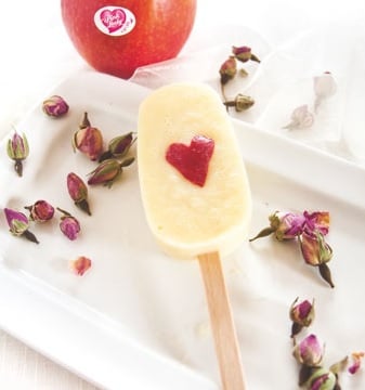 Pour décorer le sorbet glacé, entailler une figurine dans la peau de la pomme (un petit coeur ou la forme que vous préférez).