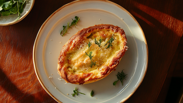 Démouler le soufflé et servir avec une salade de roquette.