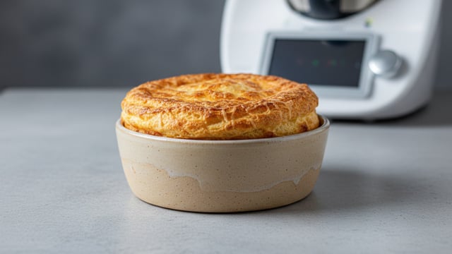 Verser la préparation dans un moule à soufflé beurré et fariné et cuire au four 35 à 40 mn à 180° (th. 6).