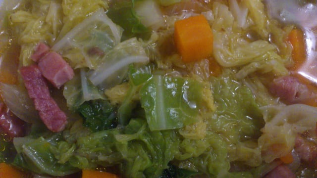 Dans la marmite mettre de l'huile d'olive, le bouillon de cube et faire suer l'oignon, les lardons et les carottes, ensuite mettre le chou et faire cuire pendant 5 minutes, saler.