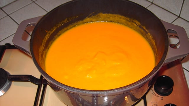 Dés de potiron et carottes revenues au beurre et lier en fin de cuisson par des portions de fromage fondu on peut ajouter quelques petites pincées de persil haché pour le décor au moment de servir