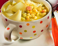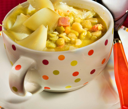 - 4Porter le tout à ébullition, puis baisser à feu doux et laisser mijoter 1 h à couvert, en remuant la soupe de temps en temps. A la fin retirer le laurier et ajouter le Comté râpé.