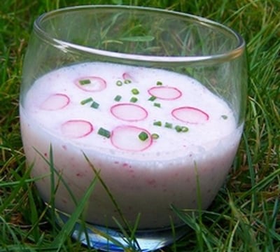 Dresser dans des verres la soupe et déposer dessus les rondelles de radis et la ciboulette ciselée !