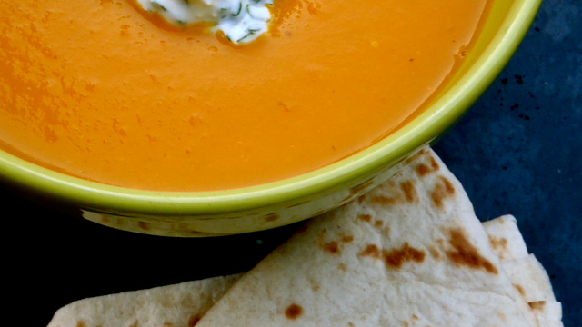 Une merveilleuse soupe facile a préparer... elle devient encore plus savoureuse avec cette crème de fromage blanc au gingembre et coriandre. Vous pouvez remplacer le fromage blanc par de la crème fraîches ou du yaourt grecque. Servez avec des tortillas.