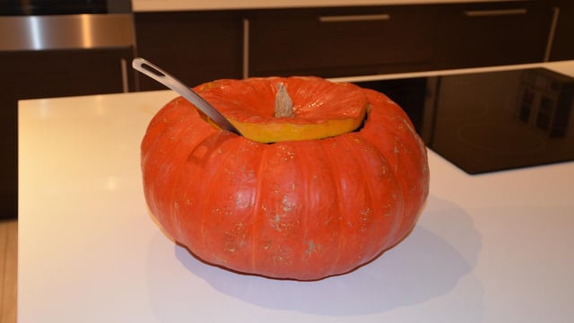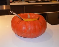 Prendre une grosse citrouille, pour pouvoir s'en servir de soupière ( ici 34 cm) et la vider tout en laissant une certaine épaisseur. Pour ce faire, découper d'abord un chapeau puis creuser au couteau ou à la cuillère.