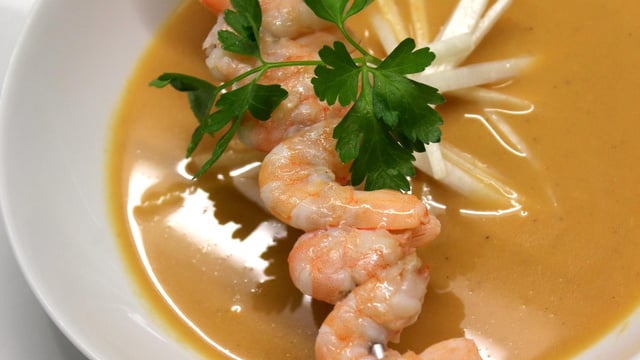 Pendant la cuisson moi je fait des brochettes avec les crevettes et une julienne d asperge crue pour le croustillant.