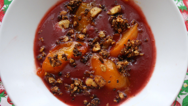Verser la soupe de fraises dans quatre coupelles , disposer dessus les quartiers d'abricots chauds et les fruits secs caramélisés.