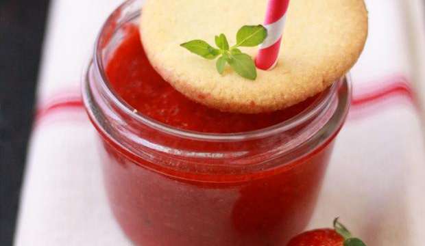 Réalisation de la souple de fraises au blender en y ajoutant le basilic, jus de citron vert et du sucre de canne. Déposez un sablé aux amendes en décoration : réalisation d'une pâte sablée détaillée à l'aide d'un emporte pièce de la taille des verrines. Cuisson 10min 180°C.