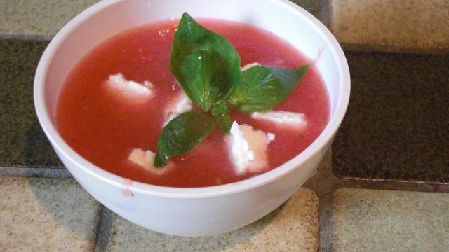 Pastèque mixée avec soupe de fraises et basilic.