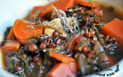 Faites revenir, l'oignon, les gousses d'ail et les carottes dans l'huile d'olive. Ajoutez les feuilles de légumes puis les lentilles rincées. Faites dorer quelques minutes. Mouillez du bouillon et ajoutez de l'eau si nécessaire. Le tout doit être recouvert d'eau de 3 cm. Diluez le concentré de tomates puis ajoutez les herbes.