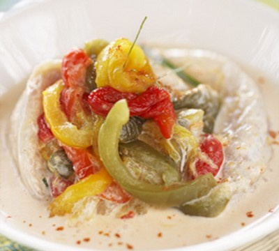 Lotte charnue, poivrons subtilement sucrés, piments piquants, lait de coco gras et doux, l'association lotte - poivron et piment - lait de coco est un régal pour le palais. Cette recette est une variation sur cette association et sur les 2 sortes de poivrons, frais et séchés. Le piment est ici apporté par une préparation pour mojo rouge, un mélange piquant à base de poivrons séchés (poivron séché dont paprika, piment, ail, cumin, coriandre). Les mojo sont des sauces pimentées, souvent riches en poivrons, typiques des îles Canaries.