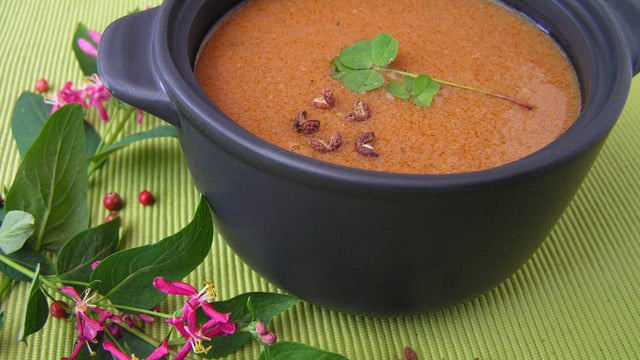 Mixez la soupe dans un blender et passez dans une passoire à gros trous pour garder de la consistance. Réchauffez et ajustez l'assaisonnement.