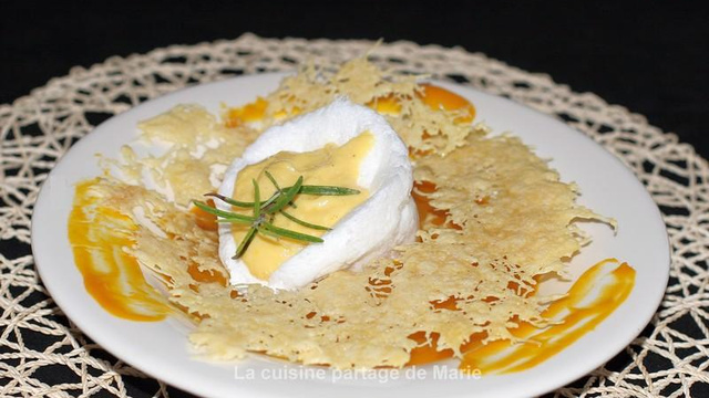 Saler et poivrer. Mixer le potimarron saler et poivrer. Dresser la soupe dans l'assiette, mettre la dentelle d'emmental le blanc en neige et compléter par le jaune d'oeuf.