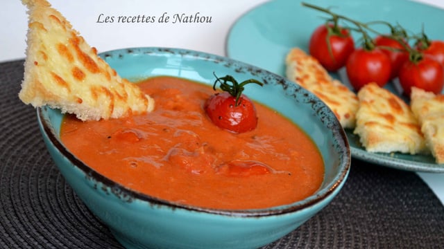 Une délicieuse soupe qui peut se déguster chaude ... ou froide comme un gaspacho :-)Je l'ai accompagnée de toasts grillés à la mozzarella...