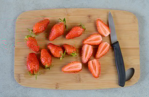 4Lavez, équeutez et coupez les Fraises du Périgord IGP en deux.