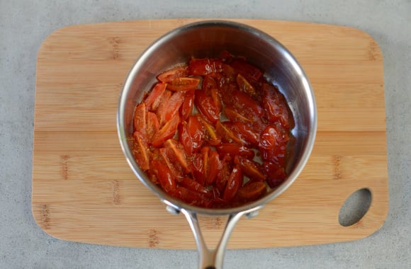 2Mettez les quartiers des tomates cerise dans une casserole et faites-les cuire à feu vif pendant 2 minutes avec 2 cuillères à soupe de sucre et 2 cuillères à soupe d'eau.
