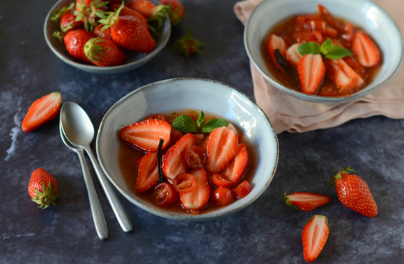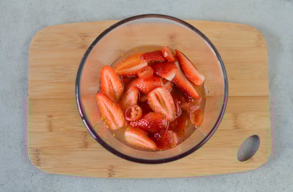 5Dans un saladier, mettez les Fraises du Périgord IGP coupées, les rondelles de tomates cerise puis versez le sirop bouillant dessus. Laissez refroidir.