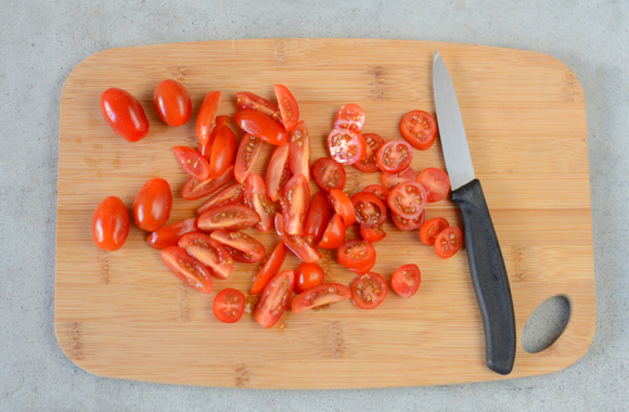 1Lavez les tomates cerise et coupez la moitié en quatre et l'autre moitié en rondelles.