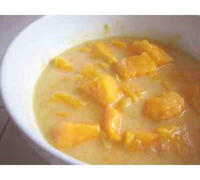 -Ajouter le lait de coco au sirop, remettre sur le feu en amenant doucement à ébullition. Jeter les mangues dans le sirop et compter 1 minute à 1 minute 30 de cuisson, pas plus. Les fruits doivent juste être saisis.