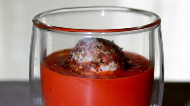 Répartir la soupe dans des verrines puis ajouter une boule de fromage aux 5 baies.