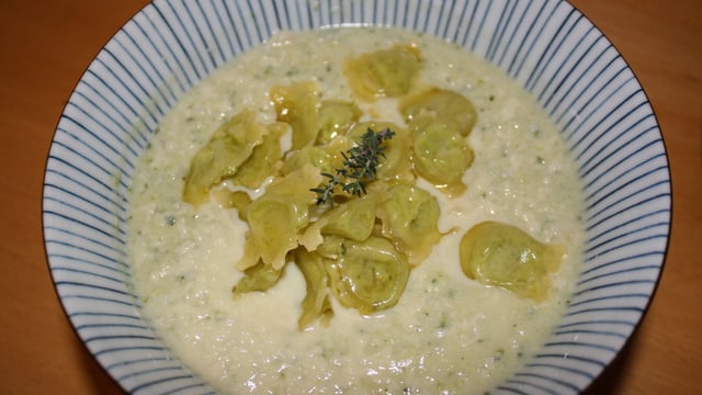 Versez la soupe dans les bols, ajoutez quelques copeaux de parmesan et répartissez les ravioles.