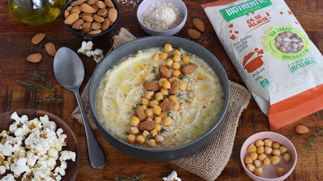 Saupoudrez avec un trait de son d'avoine, décorez avec quelques pois chiches entiers, quelques amandes entières, du thym et des pop-corn en guise de croûtons.