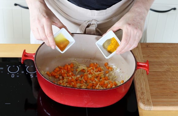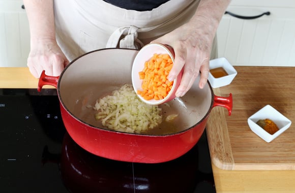 4Ajoutez l'oignon, la carotte et faites revenir sur feu doux pendant 8 minutes.