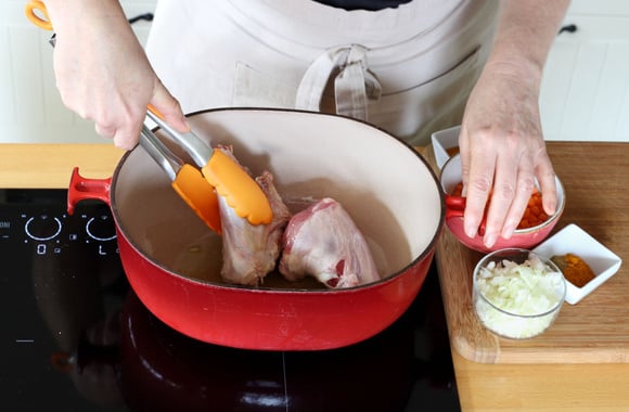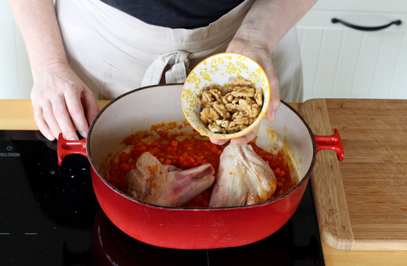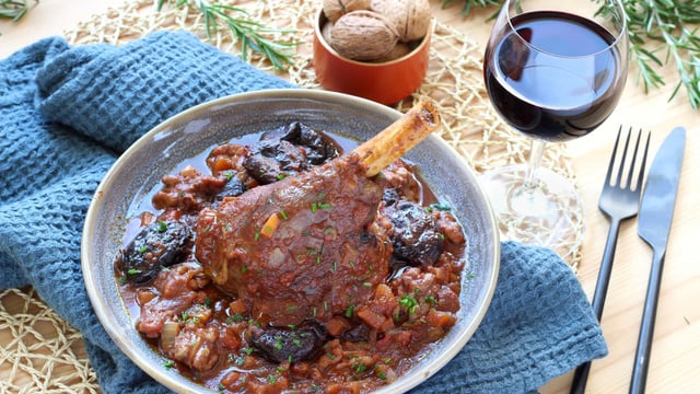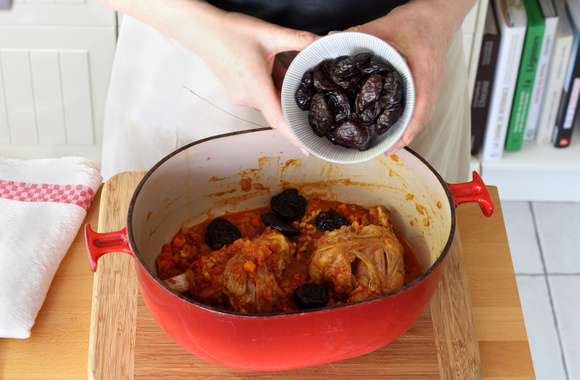 9Couvrez la cocotte puis faites mijoter au four préchauffé à 180°C pendant 1 heure et 30 minutes. Ajoutez les pruneaux, mélangez puis prolongez la cuisson de 30 minutes.
