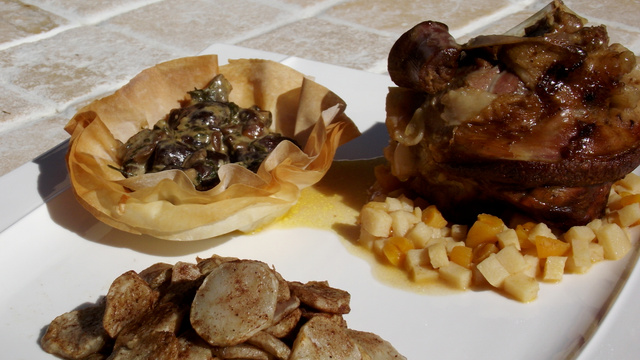 Déposez un lit de votre brunoise d'abricot et de coing, puis dessus votre souris d'agneau. Mettez votre tombée de champignons dans les paniers croustillants au comté. Faites enfin un petit tas de chips de topinambours.