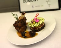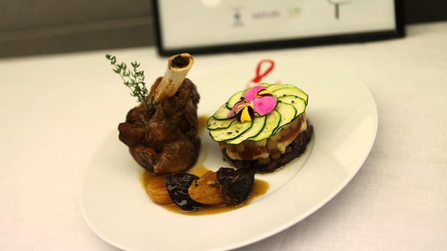 Souris d'agneau cuite en cocotte avec miel, abricots, pruneaux et divers épices, piéce montée de légumes et fruits aux 4 saveurs (sucrée, acidulée, salée, crémeux)