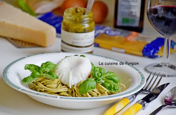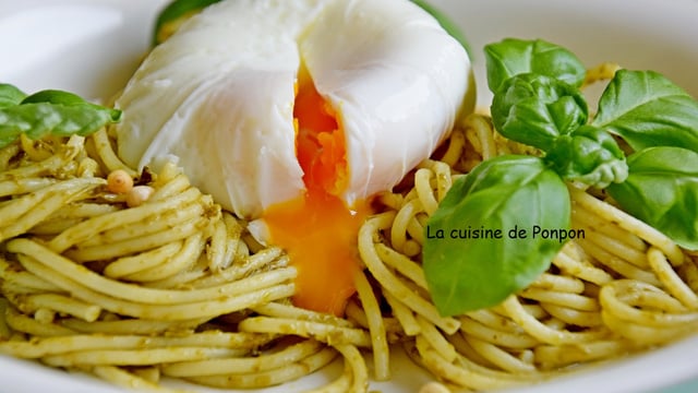 NB: Pour la cuisson de l'oeuf poché, on préconise 4min, mais 3m30, c'est beaucoup mieux. Ajouter la quantité désirée d'huile au pesto, avec un peu d'eau des pâtes ça se fait aussi!