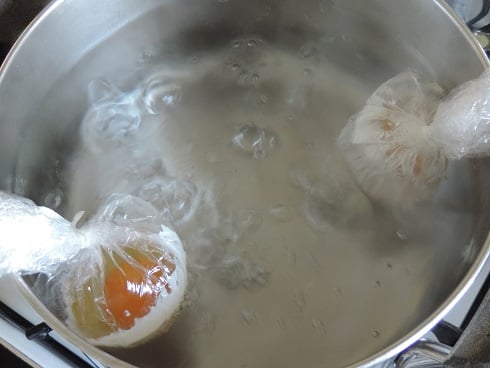 1Cuire les pâtes dans l'eau bouillante salée. 4min avant la fin de la cuisson des pâtes, préparer les oeufs pochés. Par facilité, il suffit de les emprisonner dans un film alimentaire: Placer un film alimentaire dans un ramequin, y placer l'oeuf, refermer avec un lien et le plonger dans l'eau bouillante frémissante pendant 3min30.