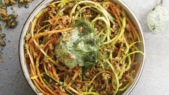 Répartissez les légumes dans des assiettes creuses, déposez une belle cuillère à soupe de fromage aux herbes, parsemez de quinoa grillé et du reste des herbes fraîches.