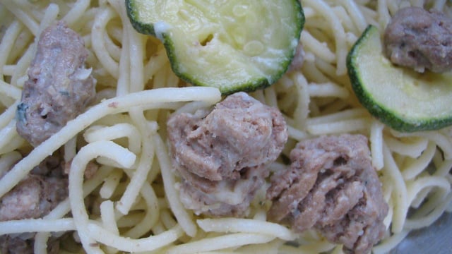 Beaucoup d'effet pour une préparation très facile: le roquefort vient apporter un petit grain de folie dans une assiette de pâtes, steack haché et courgettes.
