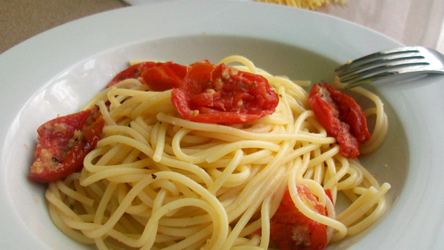 Faire cuire les spaghetti al dente dans un récipient d'eau salée. Une fois cuites, conserver de l'eau de cuisson, puis unir les pâtes aux tomates. Mélanger délicatement, en ajoutant de l'eau de cuisson, sinon votre plat sera trop sec, il vous faut un peu de sauce. Déguster bien chaud.