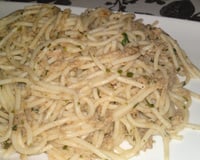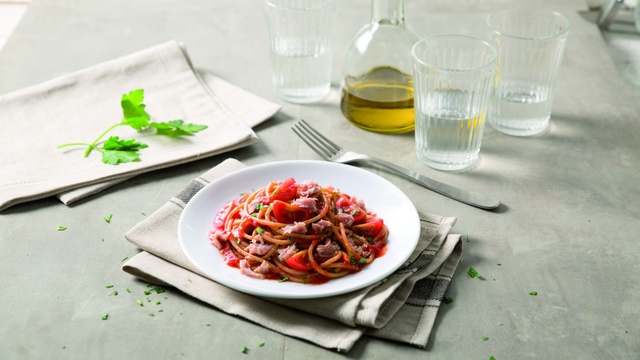 Égouttez les spaghetti integrale al dente, et mélangez avec la sauce napoletana et le thon.