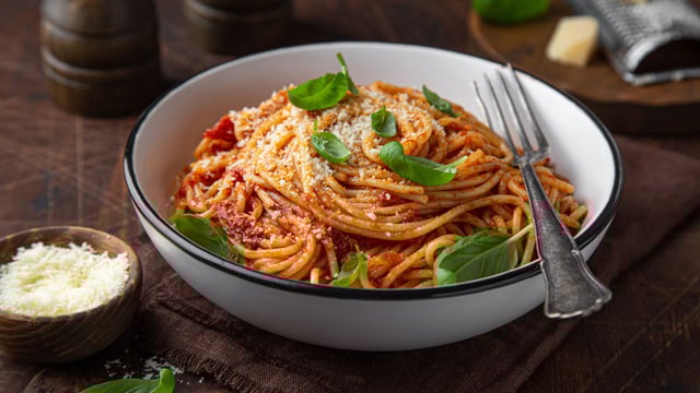 Pendant ce temps, plongez les spaghetti dans un grand volume d’eau bouillante salée et faites-les cuire selon les indications du paquet.