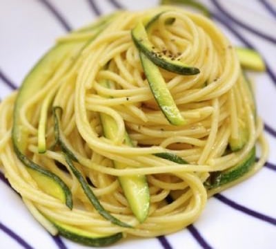 Spaghettis avec des courgettes poêlées en lamelle à l'huile d'olives et pignons.